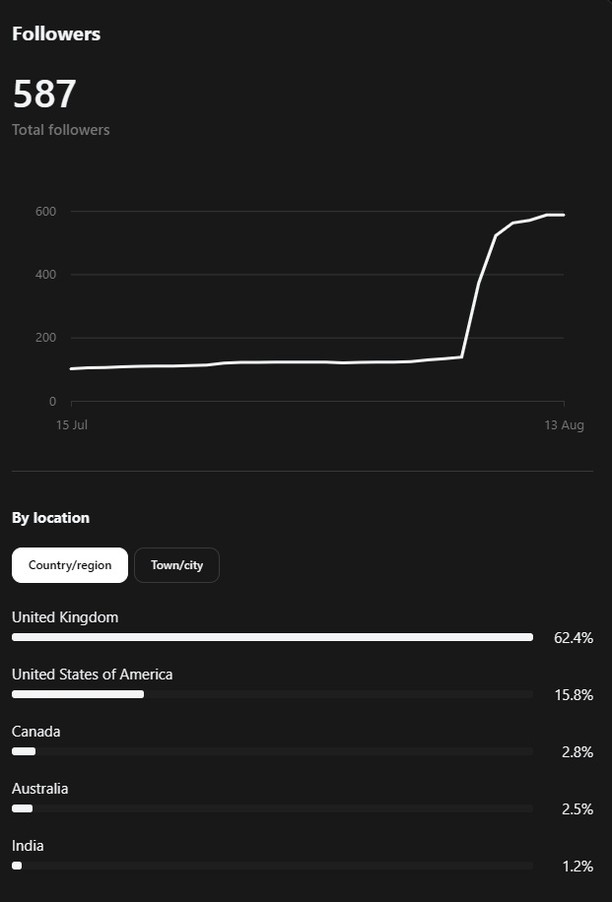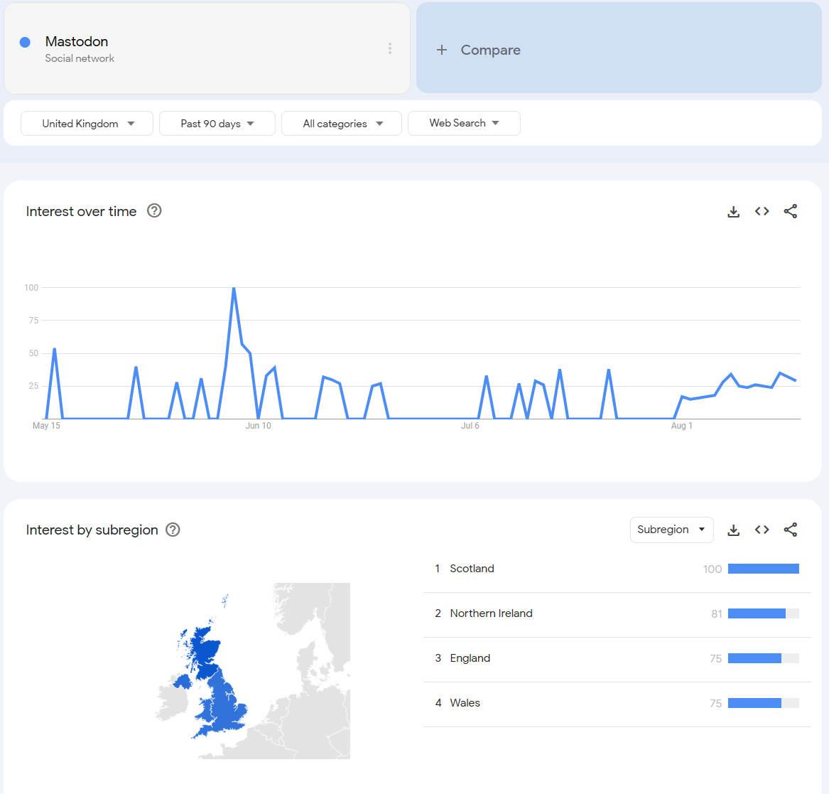 Likewise, Google Trends didn't see a substantial spike like with Threads and Bluesky. Activity is steadily picking up, but nowhere near the levels of Threads and Bluesky. Interestingly, a lot of the activity is in Scotland, a place which has its own Mastodon server - mastodon.scot.