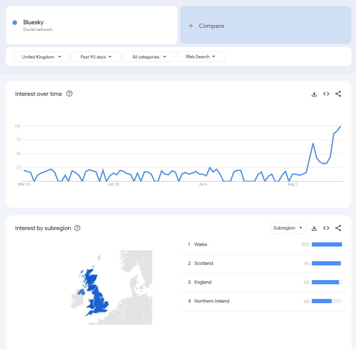 My Threads feed was full of people from the UK who'd left X and were looking for their community again, Bluesky and Threads were both trending on X for multiple days, and top voices in the UK posted to X that they were seeking alternatives.
