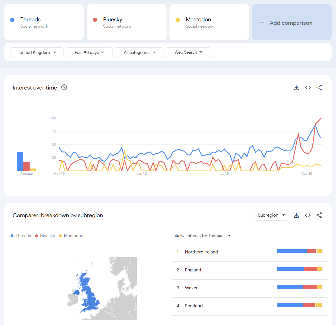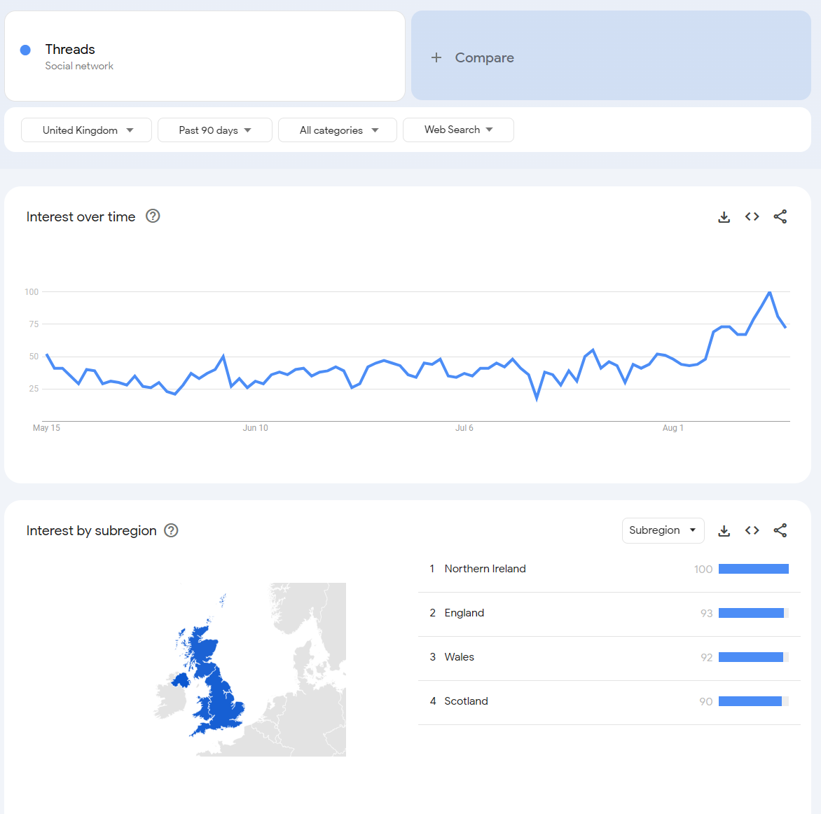 From Google Trends, you can see an incline in Threads mentions in the UK: